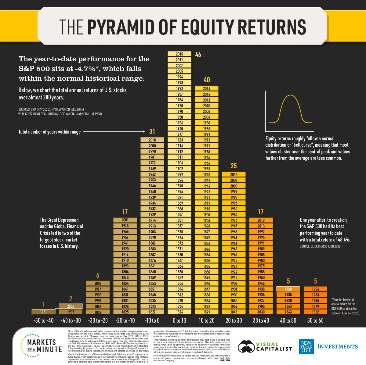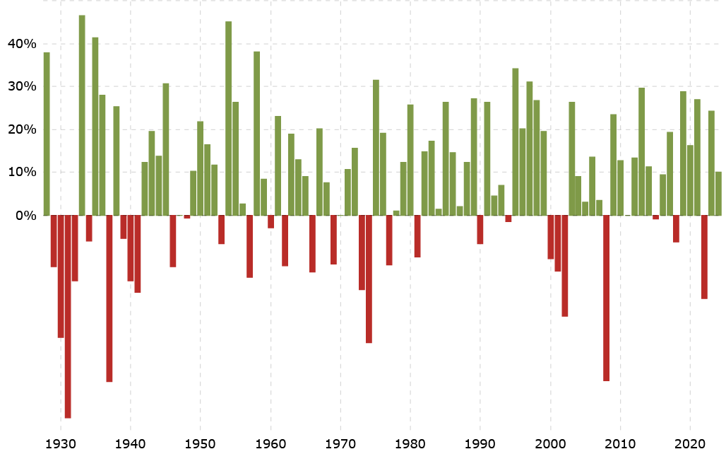 S&P 500 nedan, med åren grupperade baserat på avkastning, notera att de positiva staplarna är fler och högre än de negativa.