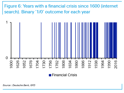 Riksbanken är uppenbarligen bekymrade över den privata skuldsättningen i samhället och finanskriser har inte direkt minskat i frekvens om man kollar denna graf från Deutsche Banks “The age of disorder” paper från förra året. Bra läsning förresten.