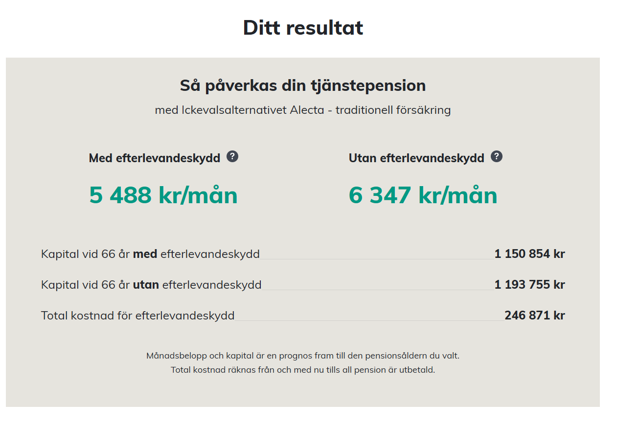 Gäller det kollektivavtalade försäkringar så rekommenderar jag att du kikar in hos Konsumenternas och räknas ut vad det blir just för er. Välj kollektivavtal och sen klicka på efterlevandskydd och fyll i dina uppgifter. Vad kostar efterlevandeskydd när du har tjänstepension i ITP1 | Konsumenternas