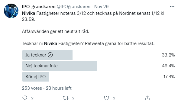 “Med ett i våra ögon rimligt p/e-tal på 20-25 så skulle detta vara en IPO att undvika. Men det är svårt att blunda för att börsen just nu har en helt annan idé om hur fastighetsvinster ska prissättas. En kursuppgång för Nivika skulle inte förvåna och vi ställer oss därför neutrala till noteringen av Nivika”, skriver Affärsvärlden i sin slutsats.