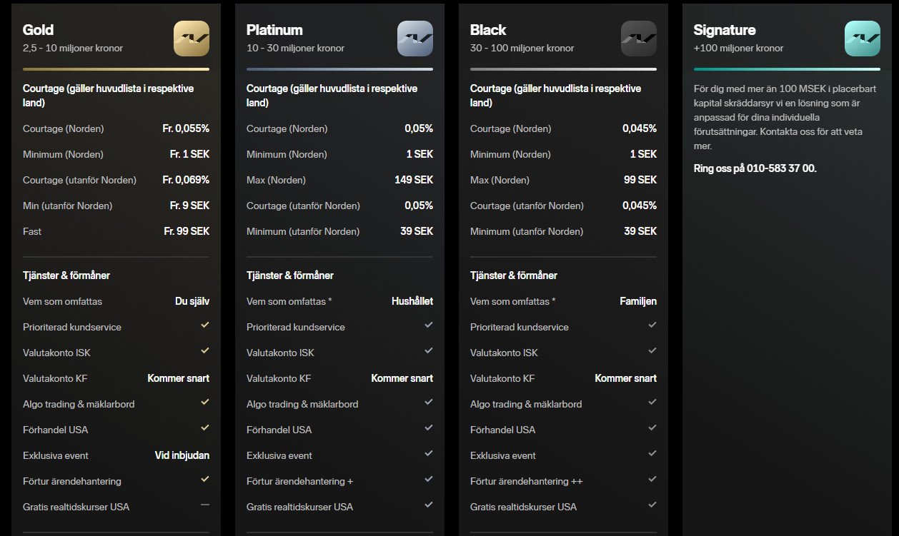 To become a Nordnet Private Banking customer, a total savings capital of at least SEK 2.5 million is required. The concept now introduces four distinct customer categories, compared to just one previously. These four categories offer different benefit packages, and the size of your total savings capital determines which category you belong to. The four categories are Gold (from SEK 2.5 million in savings capital), Platinum (from SEK 10 million), Black (from SEK 30 million), and Signature (from SEK 100 million).