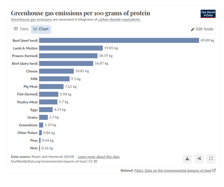 Problemet med alla sådana diagram är vilken mark är det som används, vad är det som upptas och vad är permanent som utsläpp osv. Hur relaterar utsläppen med näringsvärdet som man får ut av produkten relativt hur mycket man måste äta av det. Och tar man hänsyn till allt detta är det väl typ kött från gräsbetande djur och böngroddar som landar i topp.