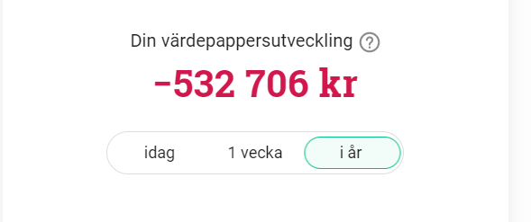 Ja, det Àr mycket röda siffror. Det hÀr Àr min Avanza-depÄ, som tur har jag en Nordnet och Lysa-depÄ ocksÄ sÄ jag slipper summera dem. ![]()