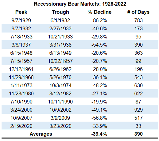 First up, these are the bear markets that happened in and around a recession going back to the Great Depression: