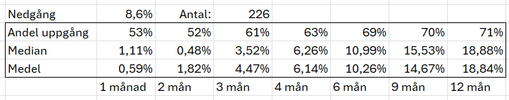 Vid 226 tillfällen sedan 1986 har OMXSPI gått ner minst 8,6% på 7 dagar, efter 12 månader ligger börsen på plus i 71% av tillfällena med ett genomsnitt på 18.8%