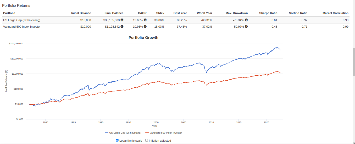 Så här ser det ut om man investerade i amerikanska börsen med 2x daglig konstant hävstång sedan 1972.
