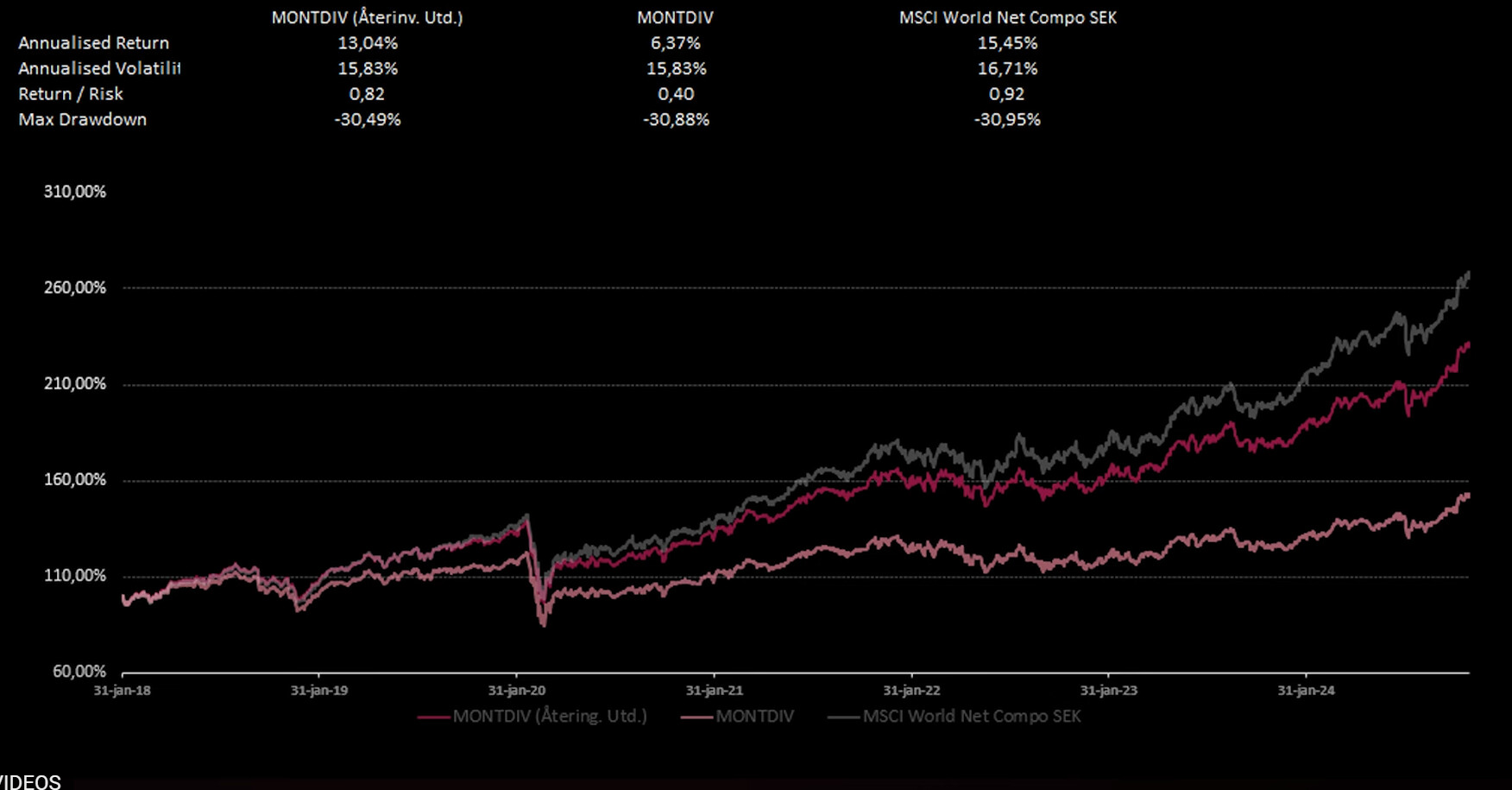 Jämför man med en fond som ger 6% utdelning per år så måste den utdelande fondens aktier stiga i snitt 6,5% per år för att vara lika bra som globalfonden, men de lyckas de inte med.