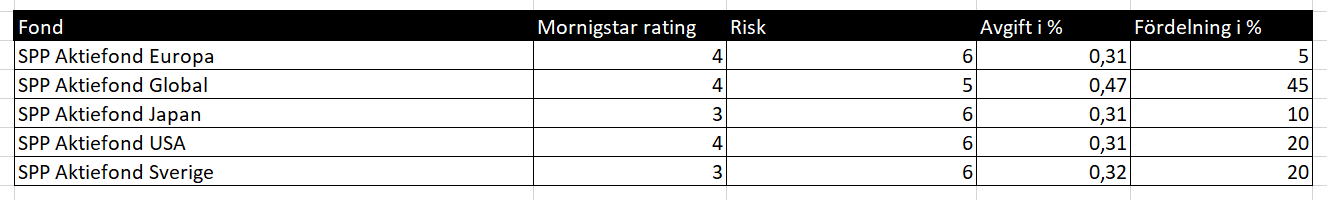 Tycker du ska lyssna/titta på pod/vlog avsnittet som kommer denna veckan här på RT. Speciellt ang. Globala portföljen som är på lång sikt (som du tjänstepensionssparar för). Då får du rätt på fördelningen mellan olika tillgångsslag. Du kan alltid “översätta” de fonderna som föreslås till vad som finns på SPP med låga avgifter (om än inte de lägsta på marknaden så är SPPs utbud helt OK).