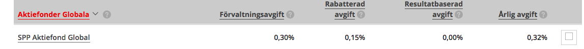 Angående avgiften så är din korrekta årliga avgift för SPP Aktiefond Global = 0,17%. Räknas ut genom att ta rabatterad avgift 0,15% plus skillnaden mellan ordinarie avgift och ordinarie årsavgift, dvs 0,02%.