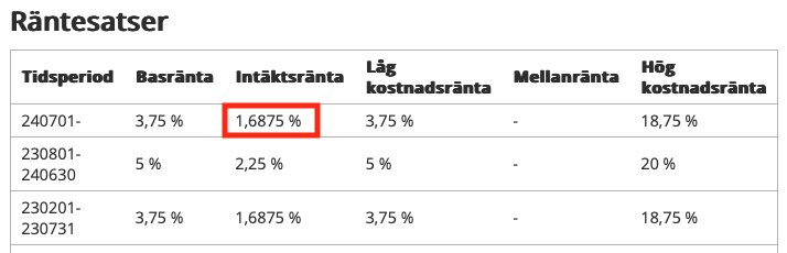 Gammal tråd men från den 1 juli 2024 är intäktsräntan tillbaka på 1,6875%. Med andra ord är det mer lönsamt att lämna pengarna på ett sparkonto med en ränta på minst 2,41% (1,6875 / 0,7). Det var kul så länge det varade…