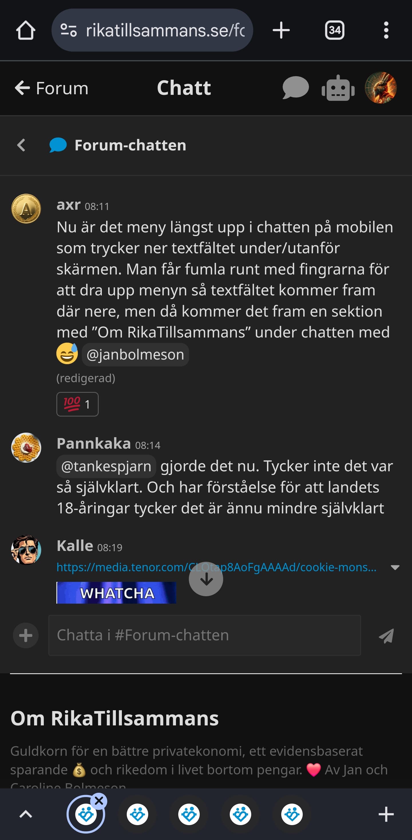 På mobilen trycks textfältet längst utanför skärmen när blåa menyn syns ovan. Det verkar bli lite random om de där sektionerna syns eller ej beroende på hur man scrollar eller när chatten laddar ny chattdata.