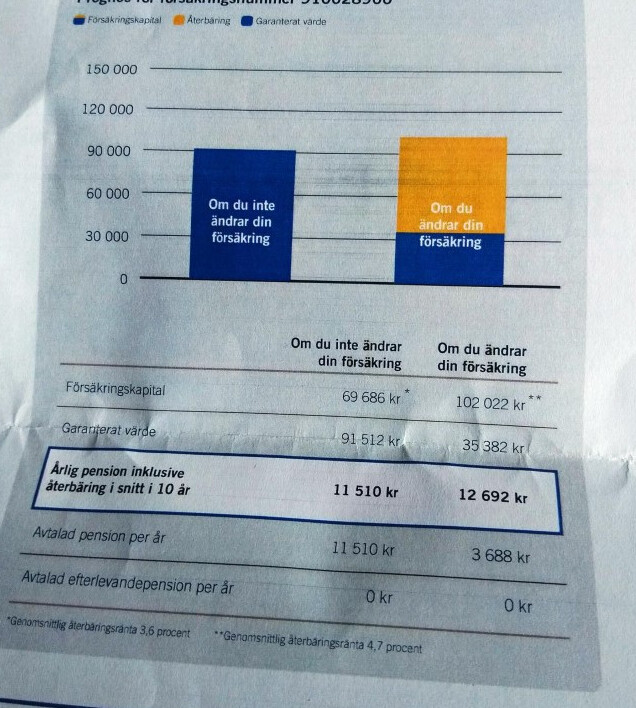 Det total försäkringskapitalet är ju rejält mycket större, men haken är ju att de sänker garantin från 91 tusen till 35 tusen. Jag skulle definitivt inte gå med på det för en uppskattad ökning från 3,6% till 4,7%.