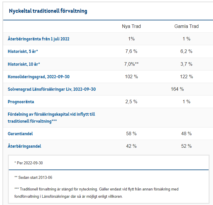 - Placeringsinriktningen är förenklat Nya Trad cirka 60/40 aktier(+alt+fastigheter)/räntor medan Gamla Trad ligger på 27/73. Inte så jättestor skillnad.