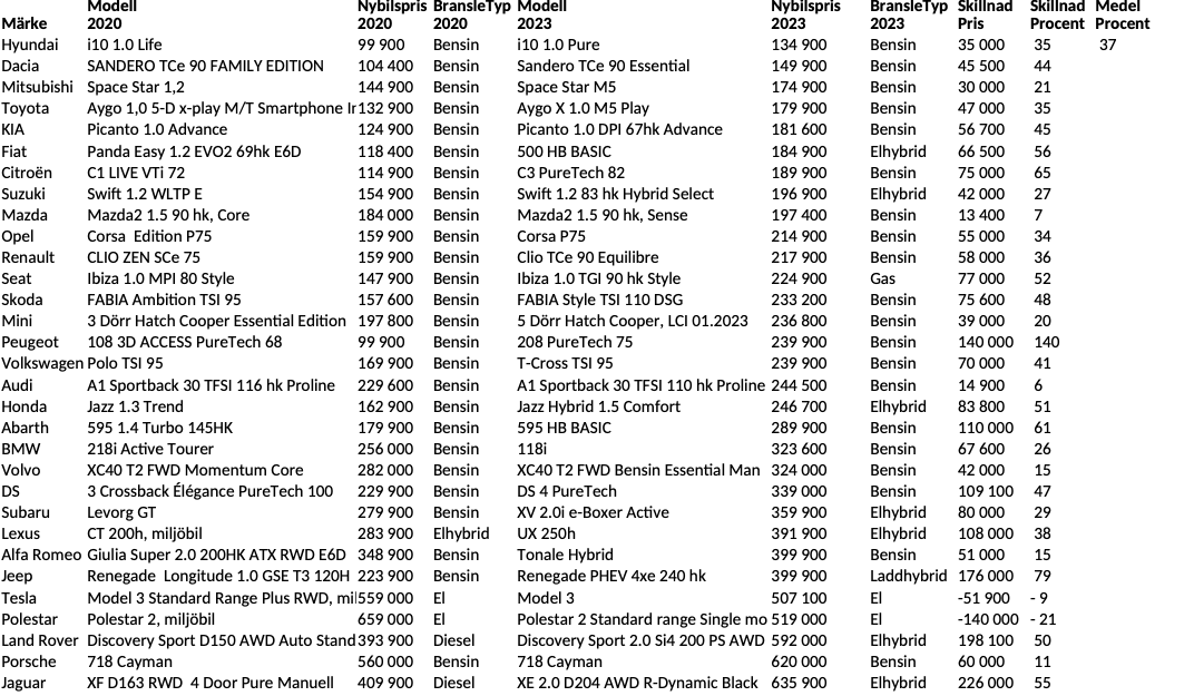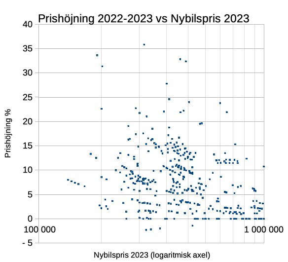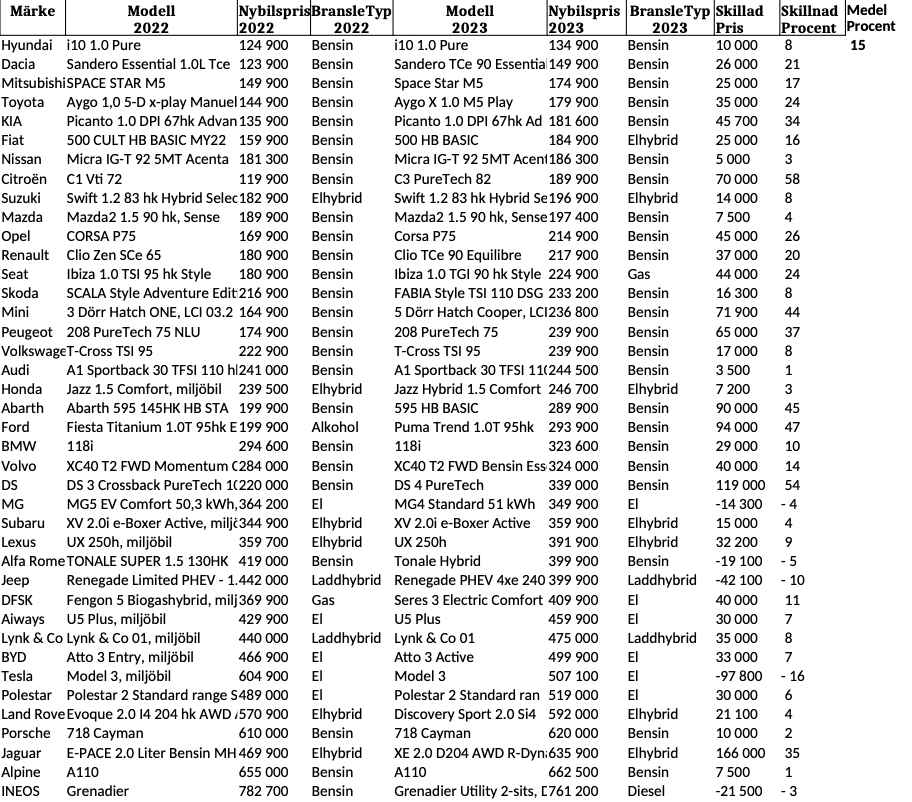 Edit: Det verkar som största prisökningen varit det senaste året. Här är samma tabell fast skillnaden mellan år 2022 och 2023 som då är 15% (trots Teslas kraftiga prissättning)