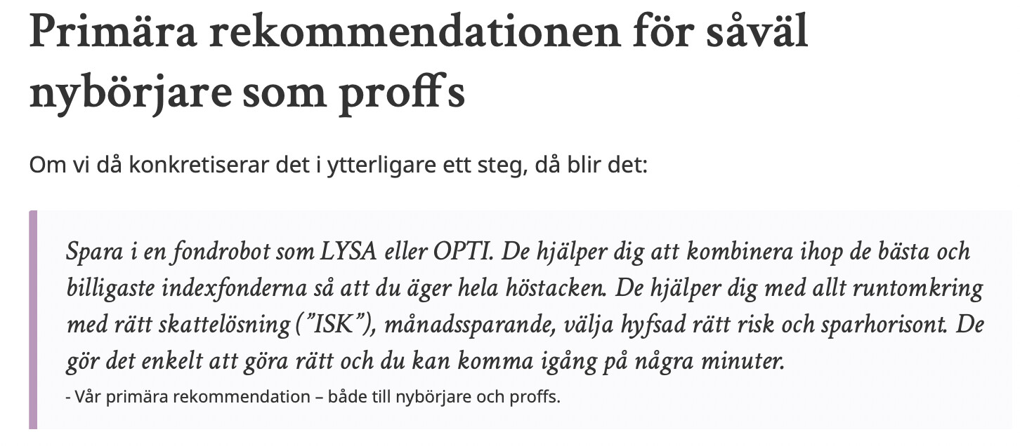 Om jag skulle använda robot så skulle det förmodligen vara Opti och deras Portdölj nr 9 för långsiktigt sparande. Anledningen till Opti istället för Lysa för mig skulle vara bättre diversifiering med bland annat råvaror. Dock är Opti mer än dubbelt så dyrt som Lysa vilket är tråkigt men för mig personligen skulle det vara tillräckligt bra.