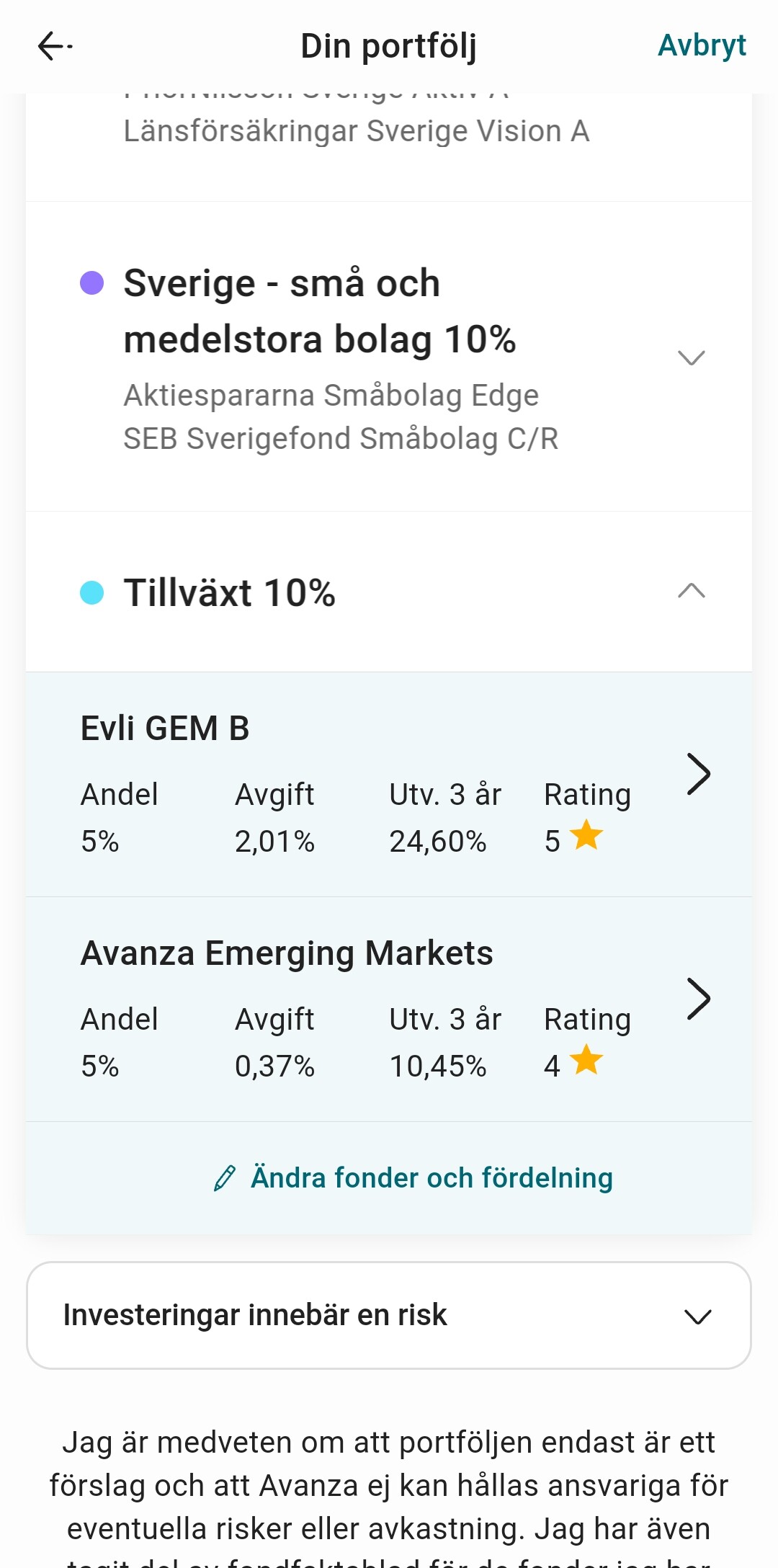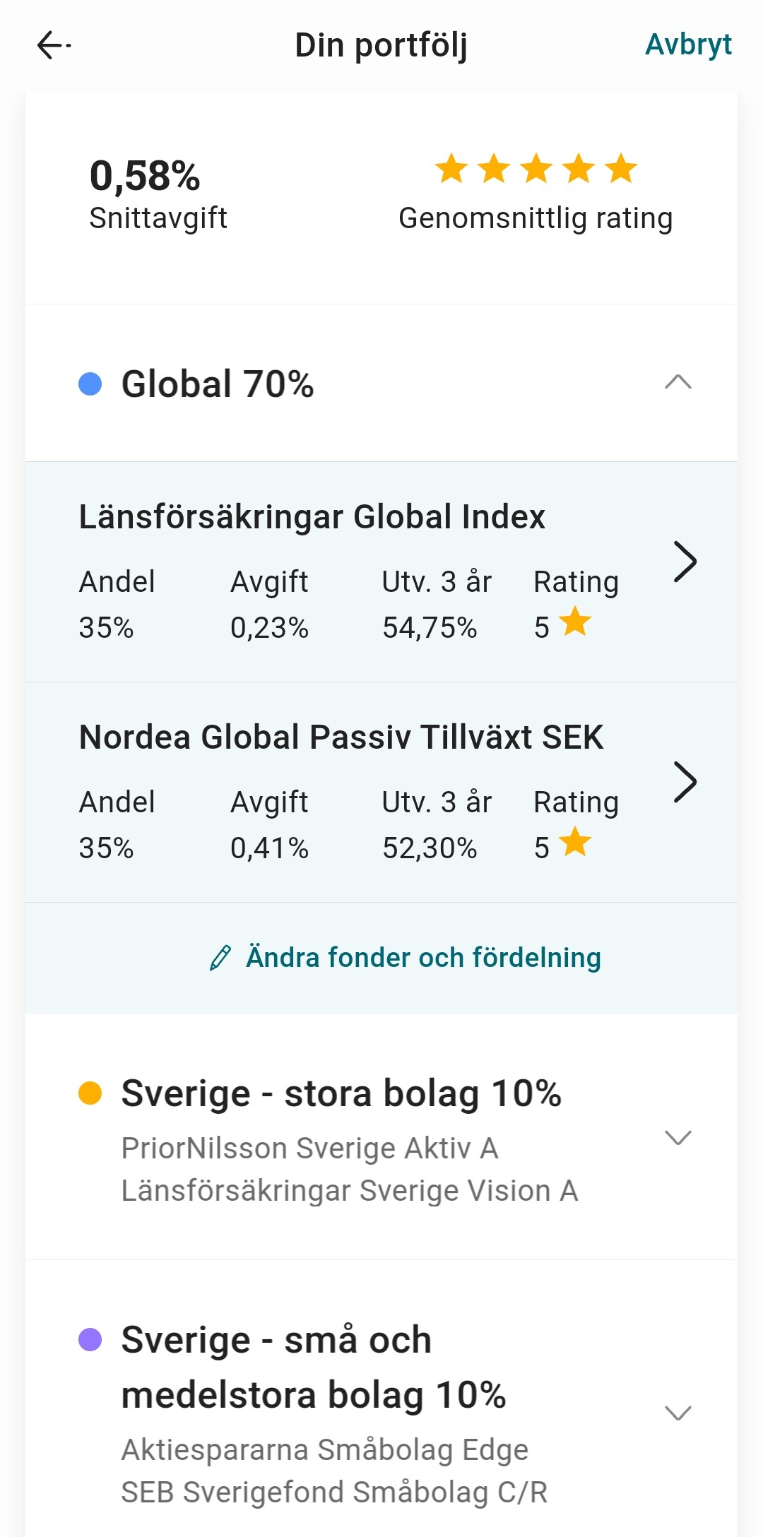 Gjorde en portfölj på avanza där de fördelade i olika fonder, vissa av de aktierna hade en avgift på över 1 procent och då valde jag alternativet spara för framtiden, delvis pensionen. Då såg det ut såhär: