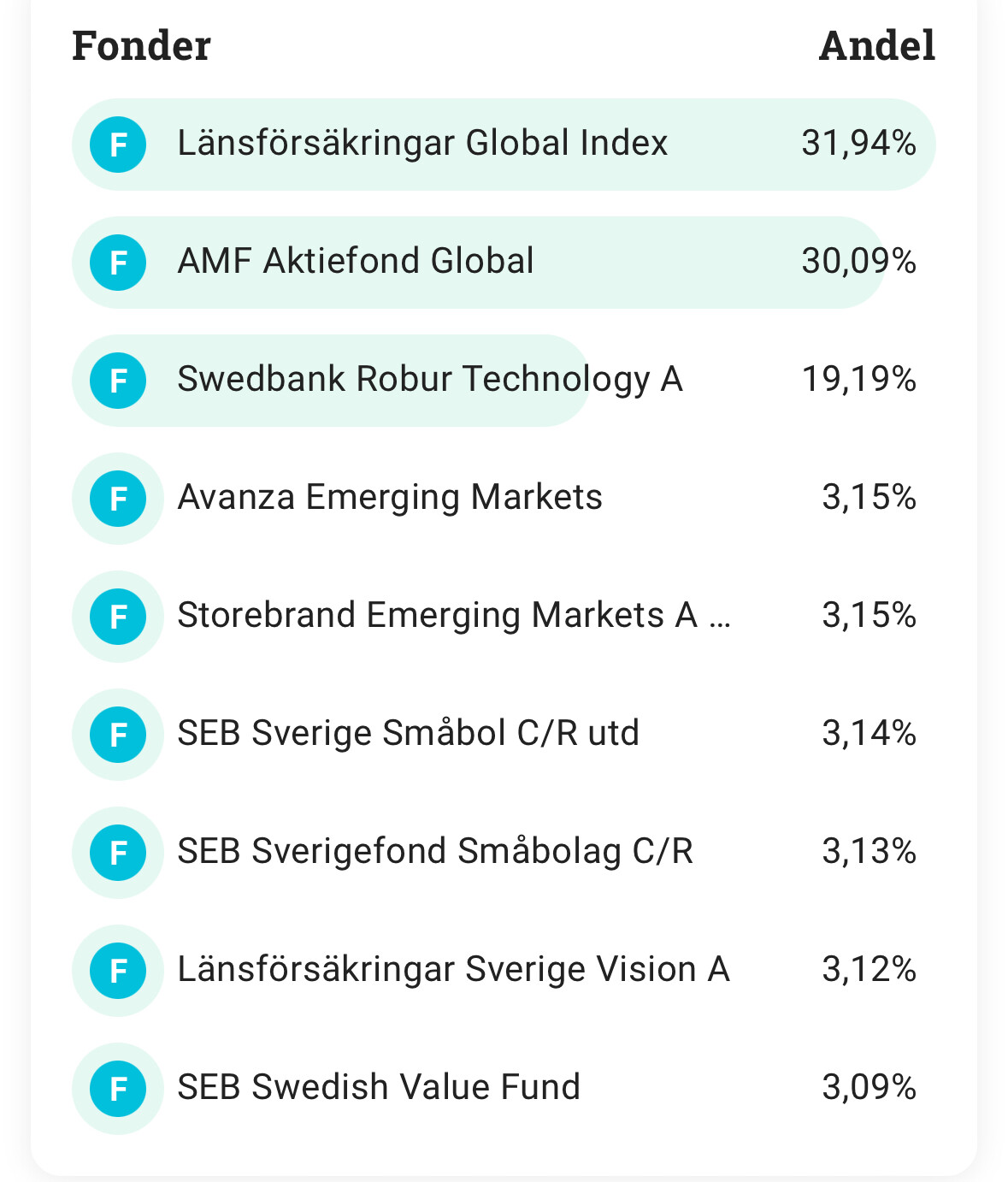 Jag personligen hade plockat bort swedbank robur technology samt plockat bort alla sverige fonder som du har och bara bytat dessa till plus alla bolag.
