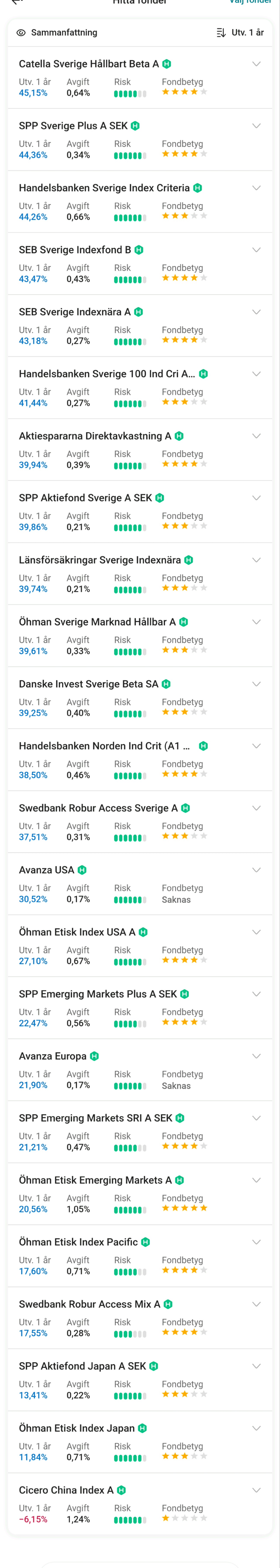 Här är en lista på dem fonderna som kommer upp med filtret via Avanza!