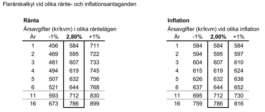 I vårt fall har man kalkylerat med 2,8% ränta och fått erbjudande förre året om ca. 1%. Betyder alltså att om räntan inte är högre än 2,8% (och BRFer får ofta bra villkor) behöver du inte oroa dig. Om räntan ökar med 1%, alltså till 3,8%, behöver årsavgiften ökas med (711-584)/12 = 10,6kr per månad och kvm. Allså ca. en tusenlapp extra avgift för varje 1% som överstiger de kalkylerade 2,8% om man bor på 100kvm.
