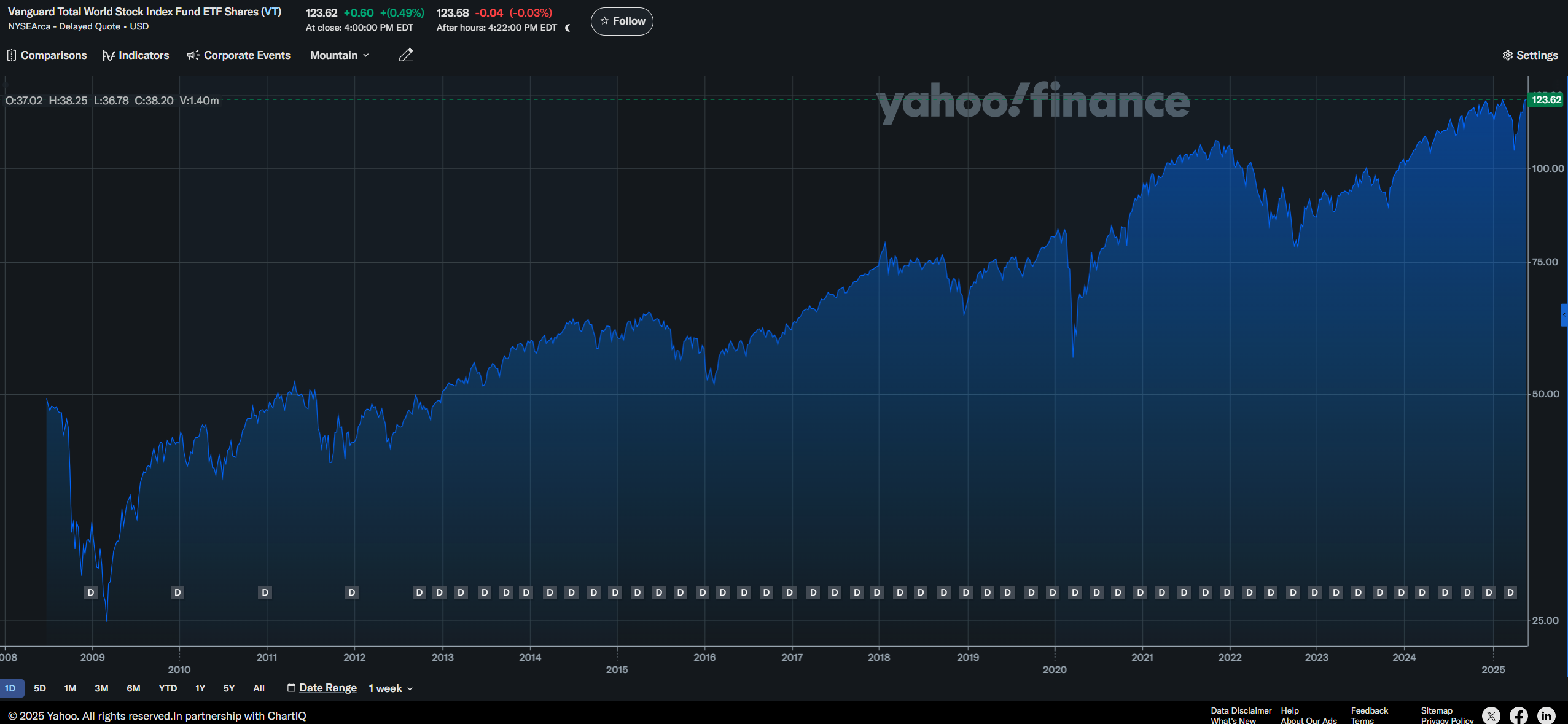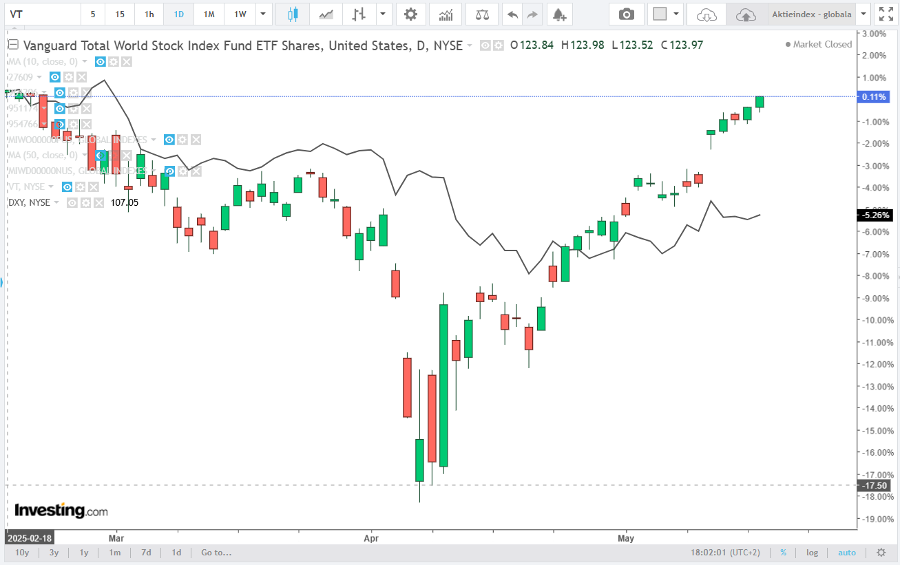 En fond som VT, baserad på ett av de bredaste världsindexen, FTSE Global All Cap Index (med både developed och emerging markets, och inklusive small cap), satte faktiskt nytt all-time-high idag den 16 maj, om man räknar in utdelningar (stängning på 123.62 idag + 0.3852 i utdelning sedan senaste rekord överstiger tidigare rekord på 123.98). I USD räknat då förstås.