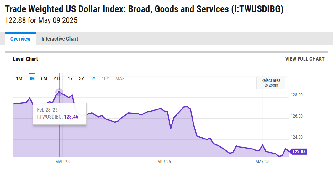 Använder man sig av den bredaste korgen (nedan), så är nedgången för USD 4,34% för nästan samma period: (128,46-122,88)/128,46≈0,0434. Dock saknas sista veckan i det diagrammet.