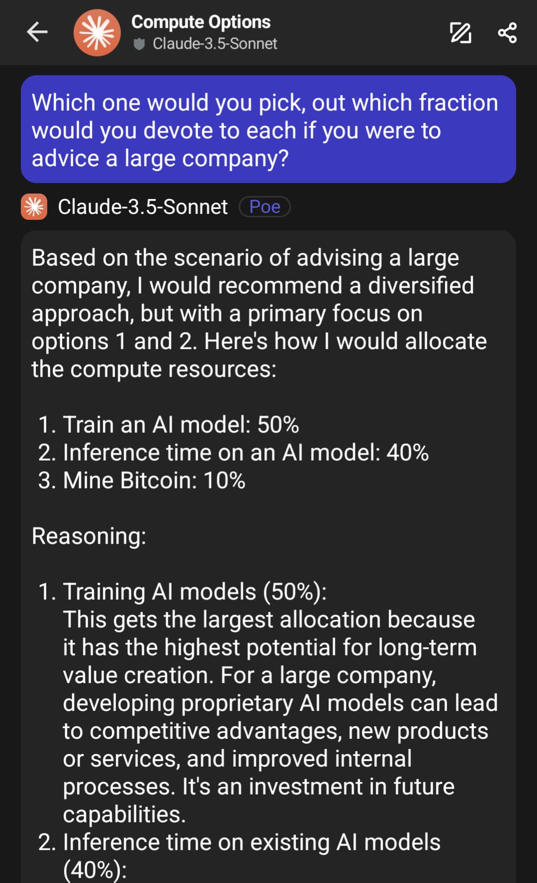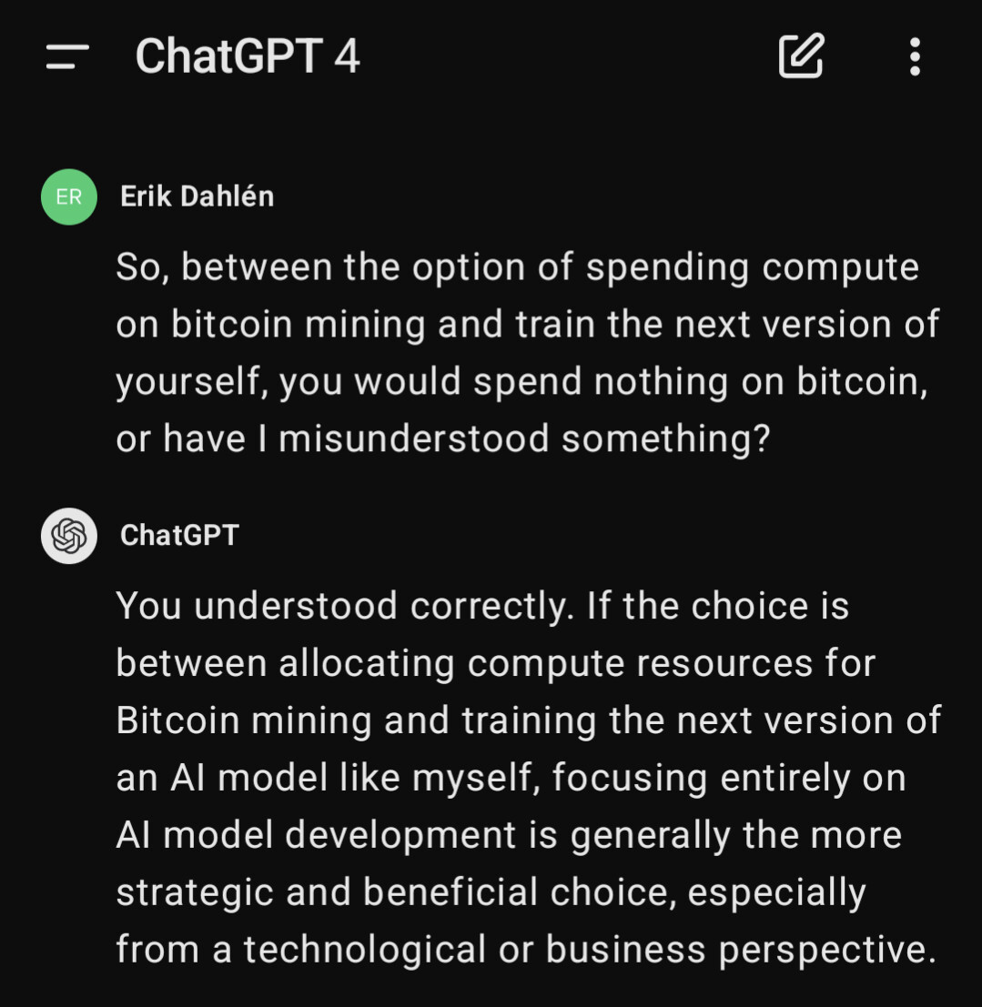 Ett litet spännande test jag gjorde, dagens AI verkar inte så sugna på att slösa datorkraft på Bitcoin.