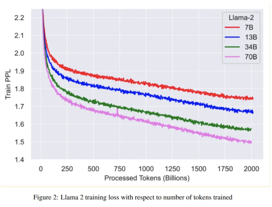 Jag tittade nyss igenom Llama 2 artikeln och såg denna graf, som tydligt visar hur deras modeller blir bättre med fler parametrar och med mer data.