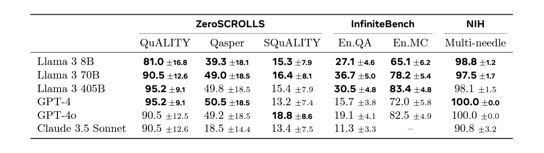 Den tekniska rapporten för Llama 3.1 innehåller många fina saker. Här kan vi se hur bra olika modeller är på att återge fakta från sitt kontextfönster.