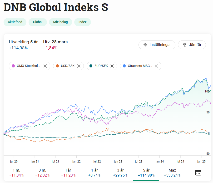 Mer specifikt jämförde jag utvecklingen av fonden DNB Global Indeks S med ETF:en Xtrackers MSCI World UCITS ETF 1C under de senaste fem åren.