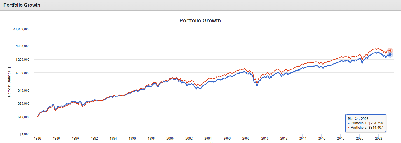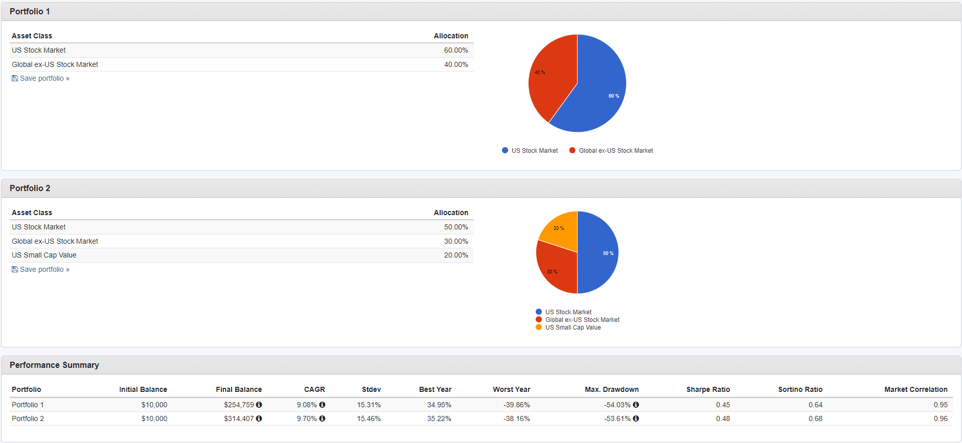 Det behöver nödvändigtvis inte blir mer riskfyllt att lägga till 20% Small Cap Value till en globalfond, ta detta exemplet där jag lagt till 20% US Small Cap Value till en markandsviktad portfölj och jämfört data sedan 1986, årlig rebalansering. Det har visats sig att det var möjligt att få bättre avkastning till lägre risk (högre CAGR och längre Drawdown), tack vare att tillgångarna inte varit helt korrelerande.