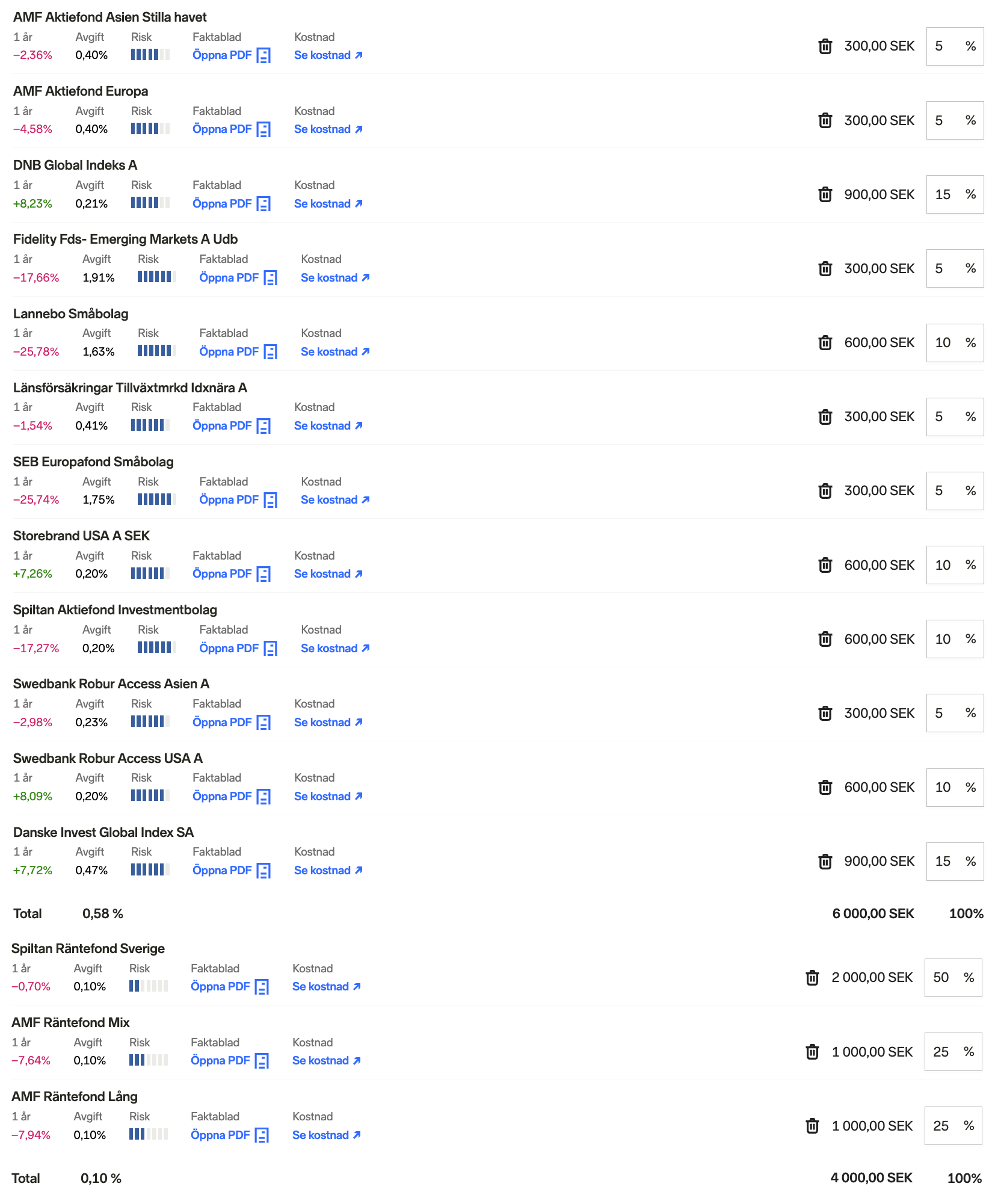 Oh jisses vilken lista. Obeaktat det enkla rådet att reducera antal fonder, så skulle jag om jag höll på med detta med den listan bara göra som så att jag putsade in hela månadens kapital i den fond som ligger längst från önskad balans i negativ riktning.