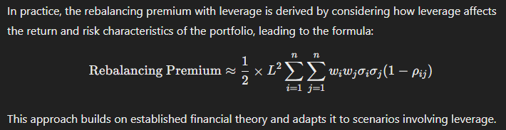 The extension to include leverage is not always explicitly presented in textbooks but can be derived from the principles of leveraged portfolios. The key idea is that leverage magnifies both expected returns and the volatility of the assets by the square of the leverage factor. Thus, the rebalancing premium is also amplified by L^2 where L is the leverage factor.
