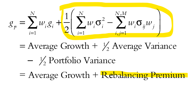 Av detta ser man att porföljen blir belönad av höga enskilda varianser (hög volatilitet) i första termen samt av låg totalvarians i andra termen, som åstadkoms av okorrelerade komponenter.