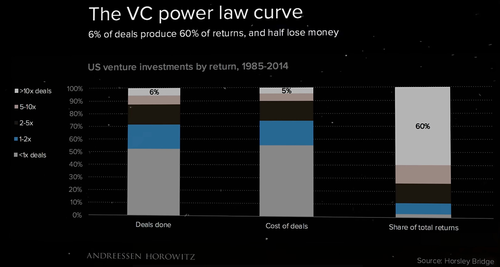 6% av affärerna stod för 60% av avkastningen. Strategin för att investera i onoterat är på många sätt ointuitiv, investera i jättemånga bolag, följ inte med i emissionsrundor och se det som lottsedlar. Fler är bättre.