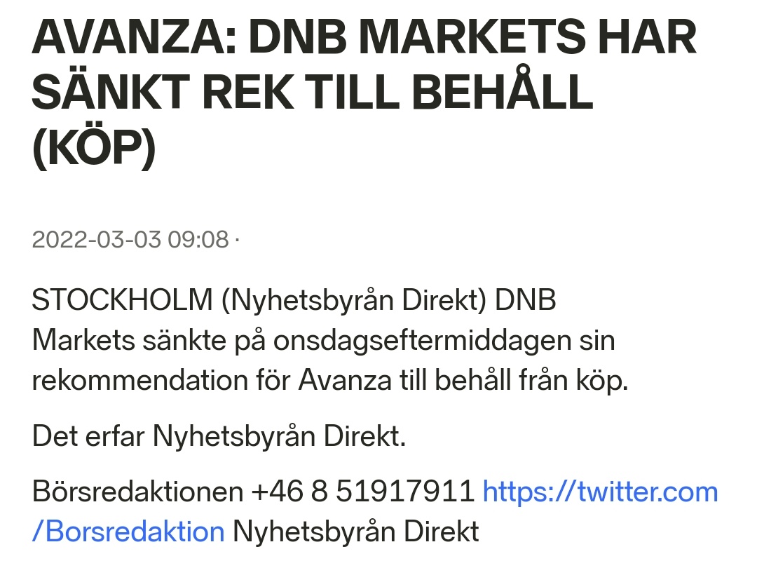Idag sänkte till exempel DNB sin rekommendation till att behålla Avanza och inte köpa just nu.