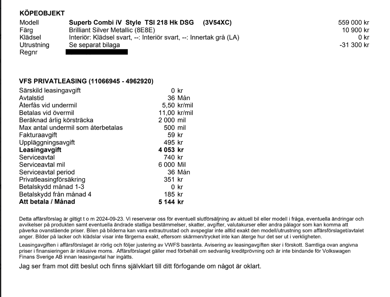 Sonderat terrängen för bilköp ett tag och skrivit ett par inlägg med olika infallsvinkel. Kanske landar i ett beslut snart… Tittar på den aktuella Skodakampanjen. Bifogar offerten som jag fick DinBil för Skoda Superb laddhybrid, 2000 mil/år. Hjälp mig skära kostnaderna i kanterna här. Hur kan jag optimera kalkylen ytterligare?
