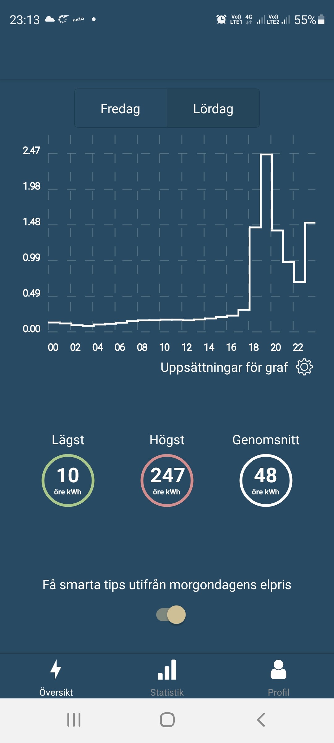 Jag efterlyser en överblick över spotpriset på el. Eventuellt en app som har en widget till Android eller om priset kan visas i google nest hub. Tips?