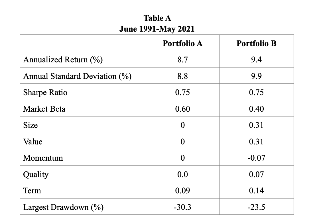 Table A below provides an example of how the Larry Portfolio might be implemented and compares the strategy with that of the typical 60/40 portfolio using a market portfolio. We will examine the 30-year period from June 1991-May 2021.