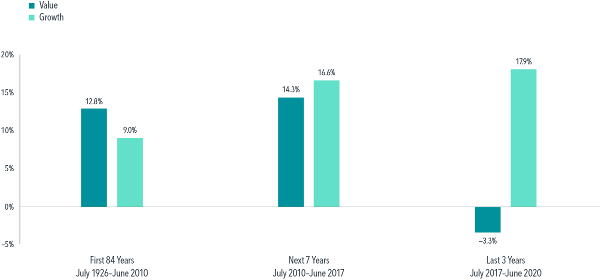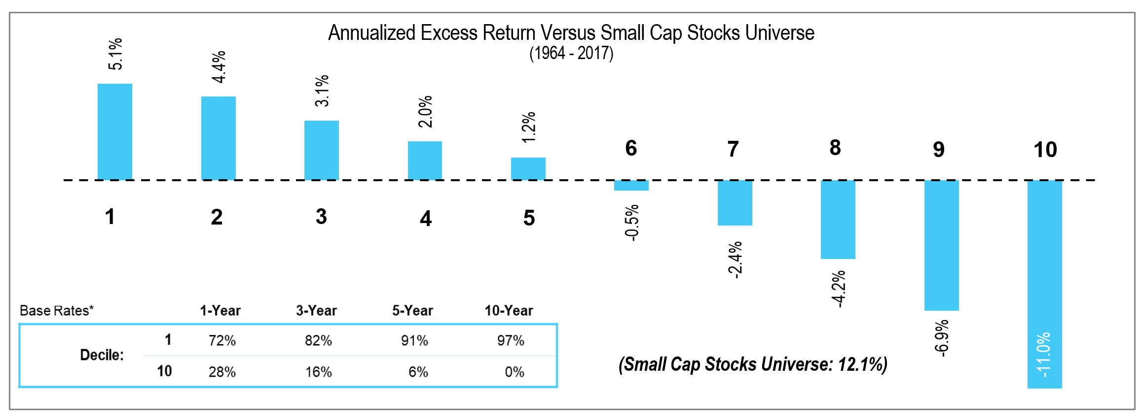 1966-1982: The S&P 500 Index returned 6.8 percent per annum versus the 7.0 percent return of one-month Treasury bills. During this period the Dimensional U.S. Small Cap Value Index returned 16.0 percent a year, an outperformance of 9.2 percentage points a year for 17 years.