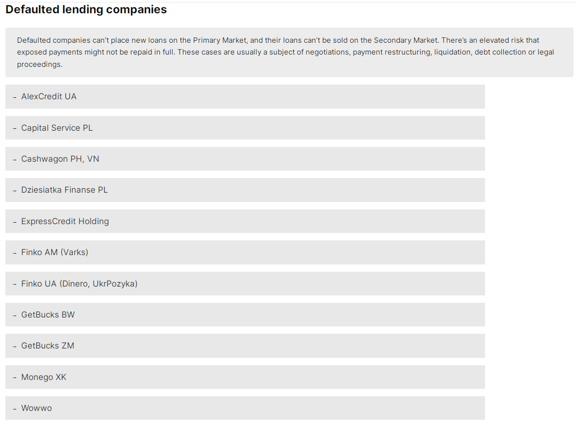 Som en siffra, Mintos som är den största aktören som har (haft) runt 50 olika företag som finansierar sig, så driver de i nuläget processer mot följande företag. Det handlar om allt från dåliga affärsmodeller som bara gått dåligt, till företag som haft verksamhet som varit förbjuden och därför blivit nedstängd av polis, till krig som ställt till det, och företag som bara jävlas och inte vill betala tillbaka pengar.