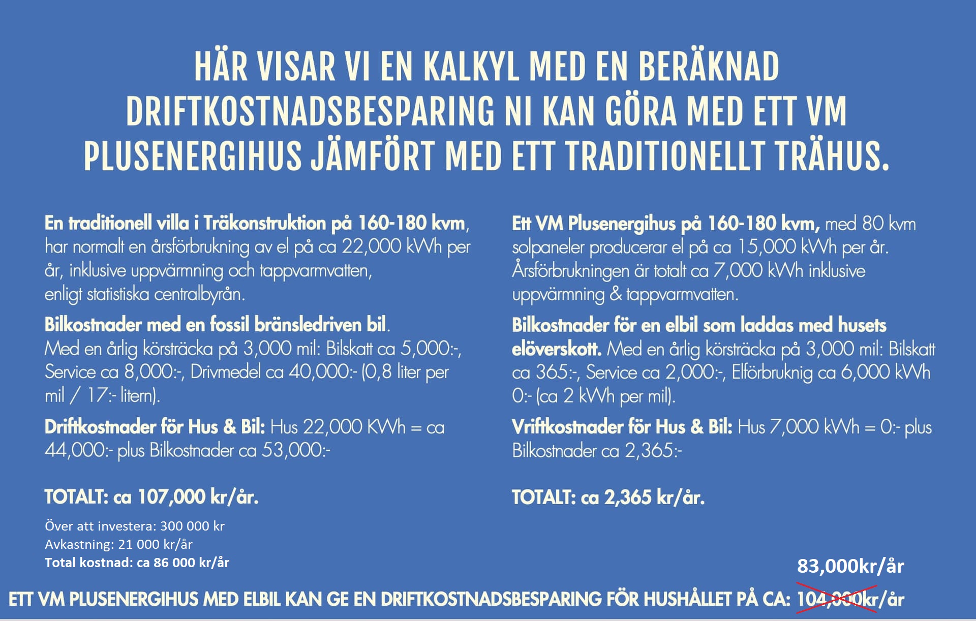 Här räknar man ändå med att ett “VM Plusenergihus” inte kostar en krona extra jämfört med ett traditionellt hus. Det stämmer såklart inte, så hur många tusen (eller miljoner?) extra får man betala för det? Och vad är alternativkostnaden för det, räknat på t.ex. 7% ?
