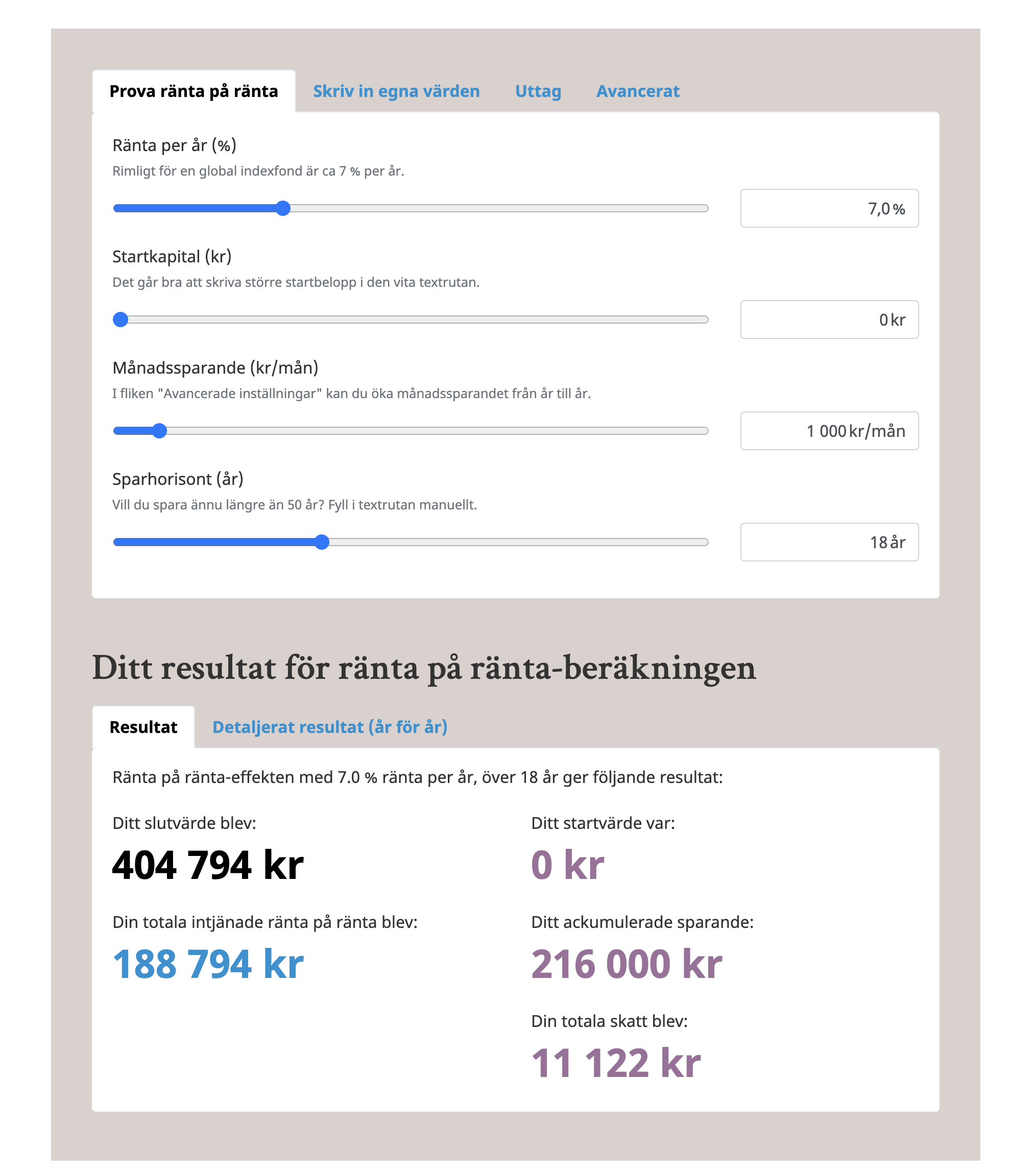 Här har du exempel, 1000kr/mån, 7% årlig avkastning i 18år