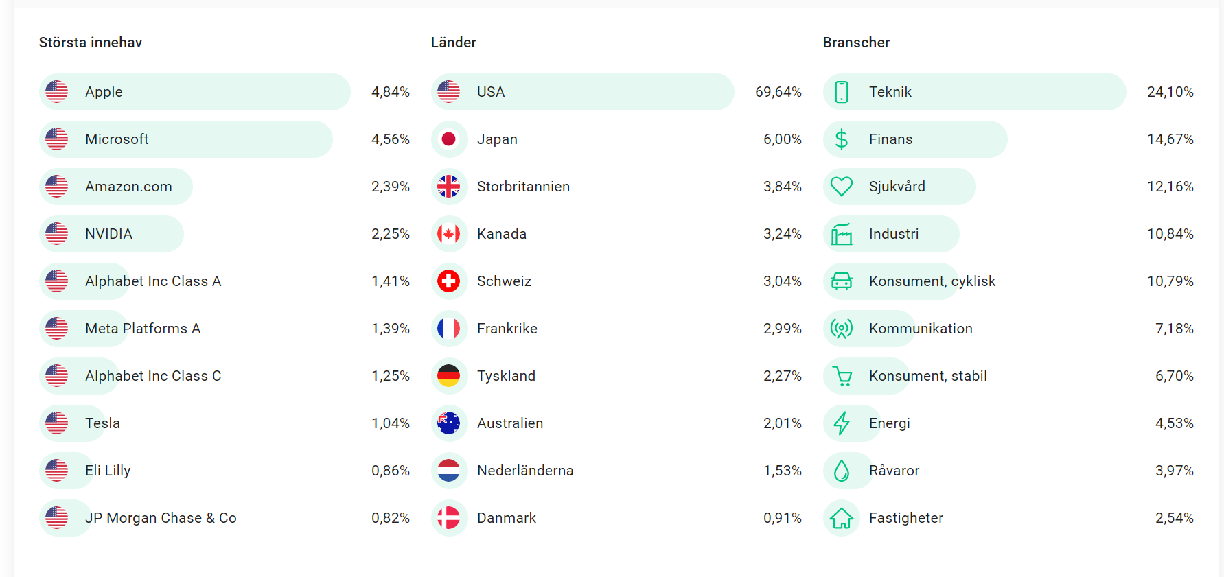 Du får över 20% tech i en vanlig globafond. Exempel från Avanza Global, men vill du ha en extra tilt mot tech så kör på. Personligen tycker jag det blir lite väl mkt.