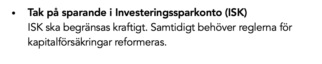 Det framgår inte i förslaget. Det enda vi vet om förslaget är att det handlar om ett tak och att “ISK idag inte uppfyller syftet med ett enkelt sparande för vanligt folk”.