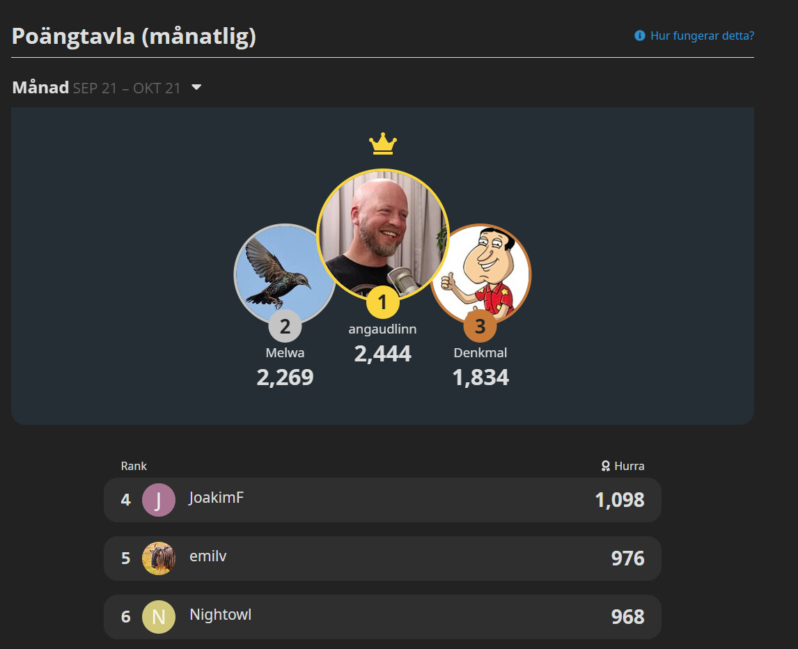 Det enda problemet ser ju att vara att @melwa som tog hem september månads pris som “chattmästare ” ligger för bra till för att ta hem även oktoberpriset. Vi andra får skärpa oss! Jag hejar på er @angaudlinn , @jfb , @Anonym och @axr .