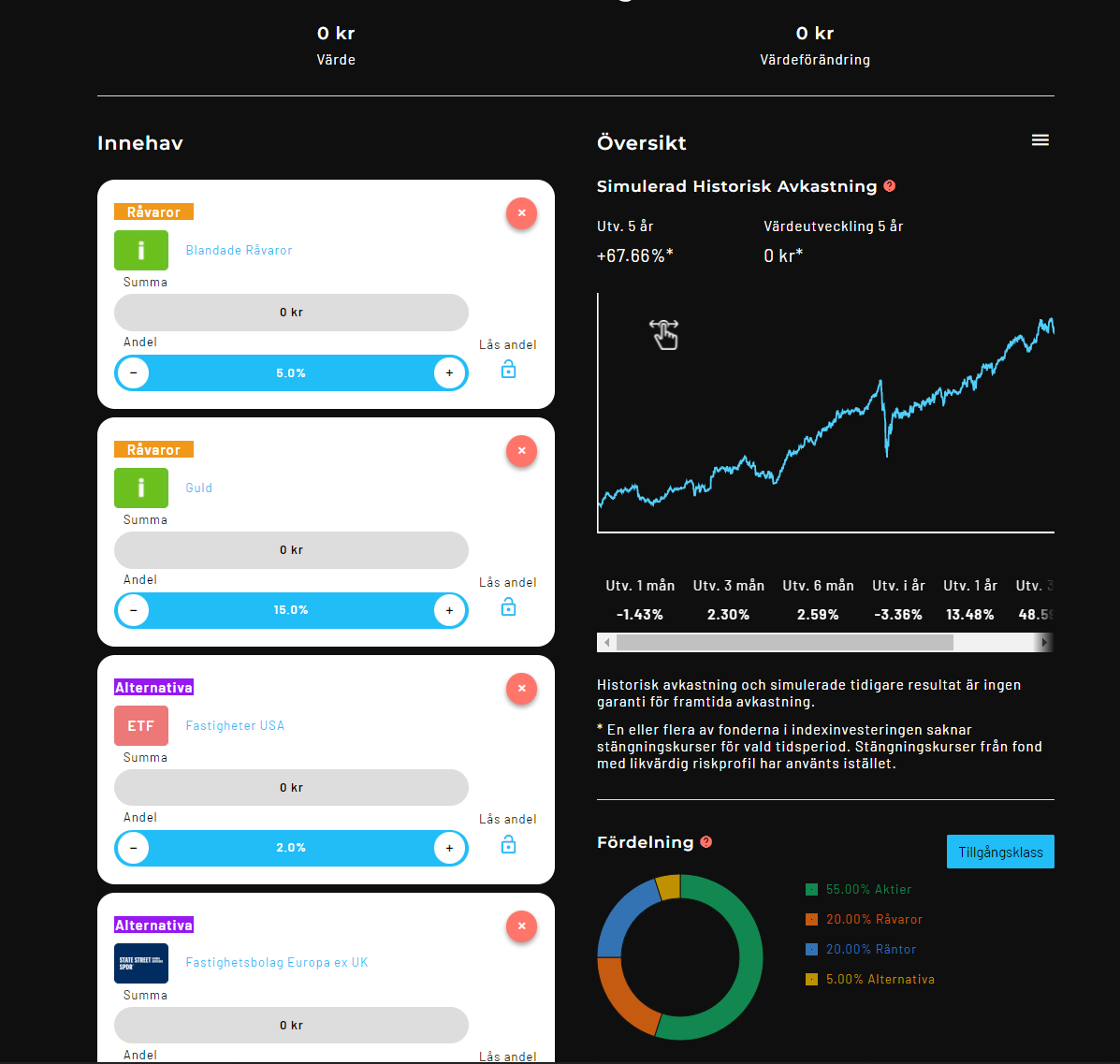 Det går även att se simulerad historisk på hur portföljen har presterad under en dålig börsår eller under Coronakrisen 2020. Att jämföra portföljen mot annat är inte möjligt just nu.