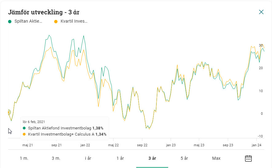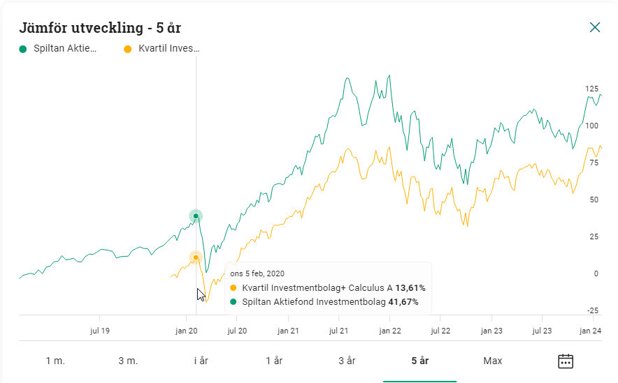 Till sist lite historik. Inte en tidsmaskin och kan inte förutsäga hur det kommer gå för Spiltan Aktiefond Investmentbolag vs Kvartil Investmentbolag+ Calculus nästa 5 år (deras angivna sparhorisont).