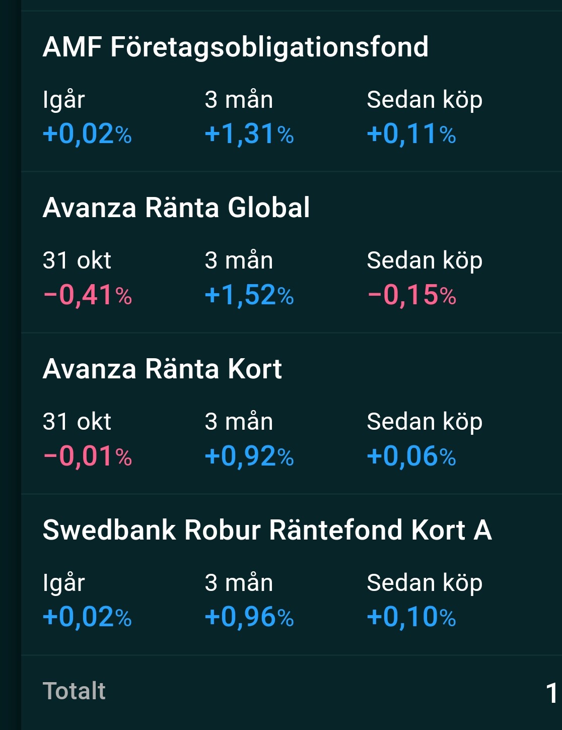 Jag experimenterar med följande ränteportfölj. Alltså 50 % korta räntor. 25 % företagsobligationer Sverige och 25 % globala företagsobligationer.