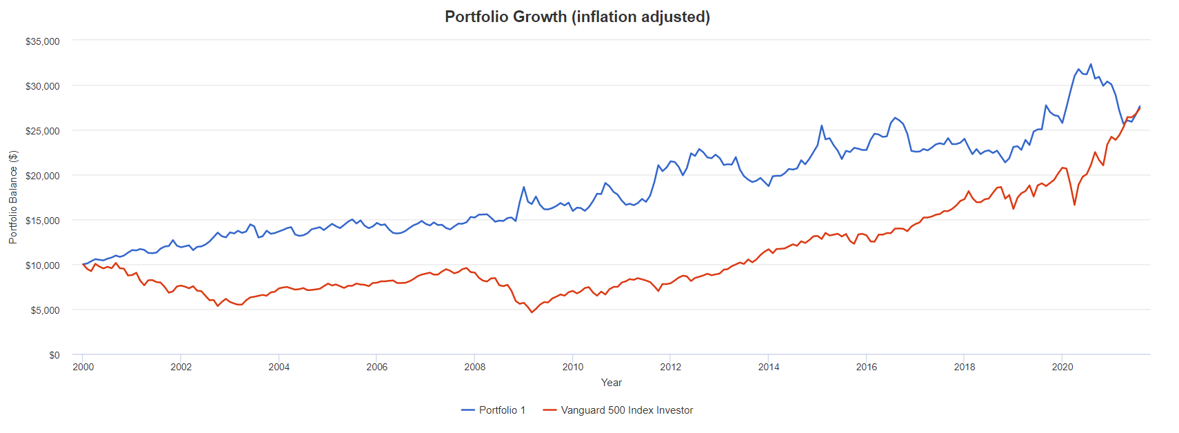 Denna tråd ämnar att diskutera de förvånande resultaten vi såg efter minimeringen av den maximala förlusten. För att åstadkomma det så har jag gjort två optimeringar; en som minimerar MAD och en som maximerar Sharpe-kvoten. Att maximera Sharpe-kvoten är det man brukar kalla för “tangency portfolio” i vanlig portföljoptimering på den effektiva fronten. Denna gång har jag använt det eminenta vertyget PortfolioVisualizer som @axr introducerade för mig. Det gör i stort sett samma sak som själv hade gjort, så varför återuppfinna hjulet?