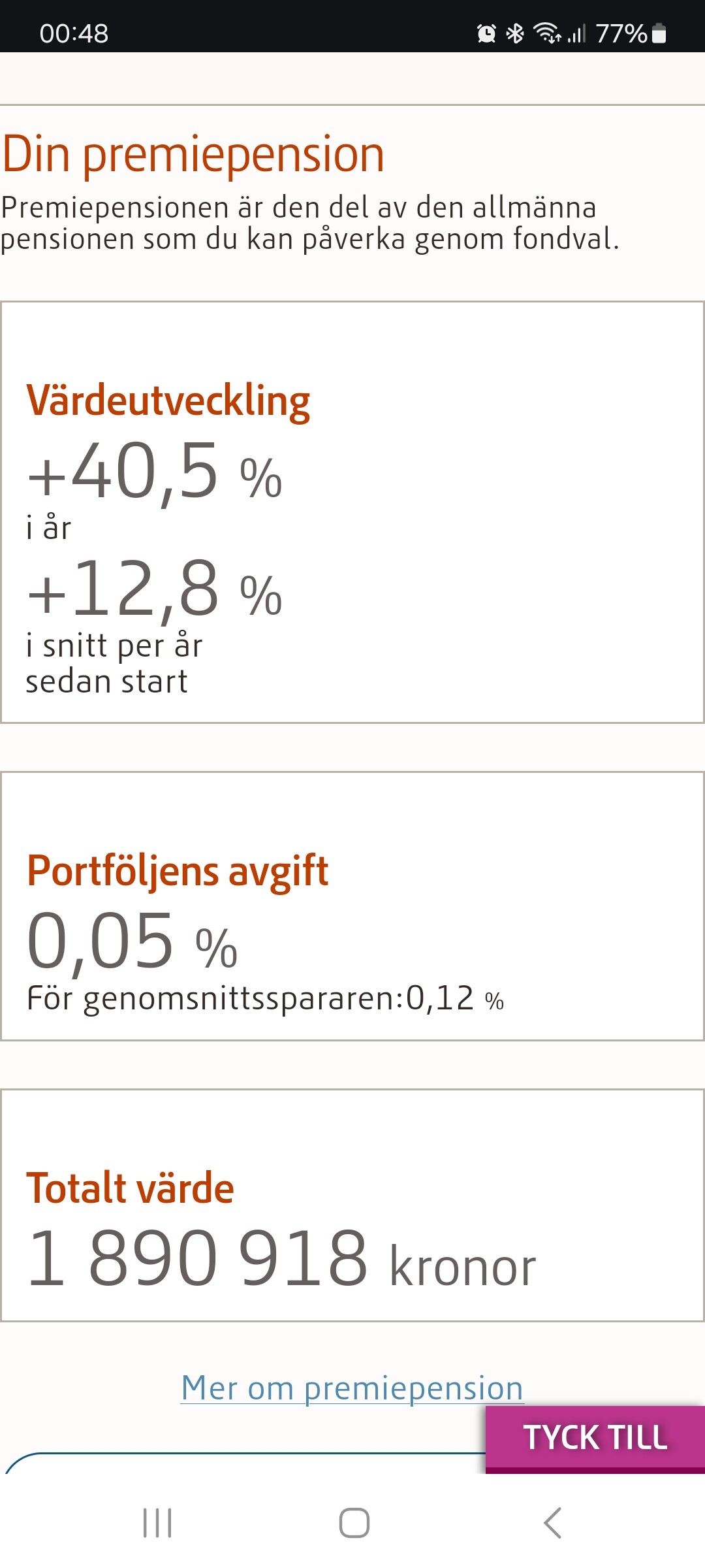 Haft AP7 Såffan sen start, just nu räcker det till en ny divansoffa till pensionen ungefär med dagens inflation.